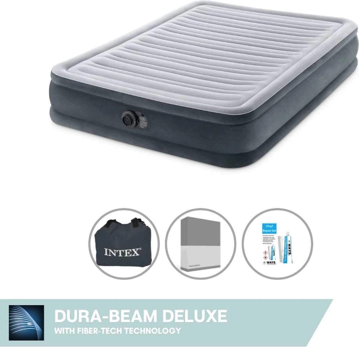 Het twijfelaar Intex Comfort-Plush ‘Full’ luchtbed met afmeting 137x191x33 cm is geschikt voor thuis en op reis. De binnenkant van het luchtbed bevat polyester draadjes die van de boven- naar de onderkant van het luchtbed lopen. Deze duizenden vezels zorgen voor perfecte stabiliteit en een uitstekende ondersteuning van het lichaam. Deze binnenstructuur met ondersteunde Dura-Beam vezels, ook wel de Fiber-Tech technologie genoemd, is een uniek kenmerk van deze Intex luchtbedden en een garantie voor een comfortabele slaapervaring. Het luchtbed beschikt over een unieke rand- en bodemringconstructie wat zorgt voor superieure stabiliteit. Daarbij bevat het luchtbed een Quickfill Plus interne pomp, waardoor u enkel de stekker in het stopcontact hoeft te steken en de knop naar ‘+’ hoeft te draaien om het luchtbed op te blazen. Om het luchtbed na het gebruik weer leeg te laten lopen, draait u de knop naar ‘-‘ en het luchtbed zal leeglopen. Het luchtbed beschikt over een zacht dubbellaagse comforttop wat zorgt voor een glad slaapoppervlak en zorgt voor een goede nachtrust. In tegenstelling tot de andere luchtbedden, beschikken de luchtbedden uit de Dura-Beam Deluxe serie over horizontale beams voor het ultieme comfort. Zo creëer je in enkele minuten een fijne slaapplek op de camping, op je logeeradres of voor gasten die blijven slapen.